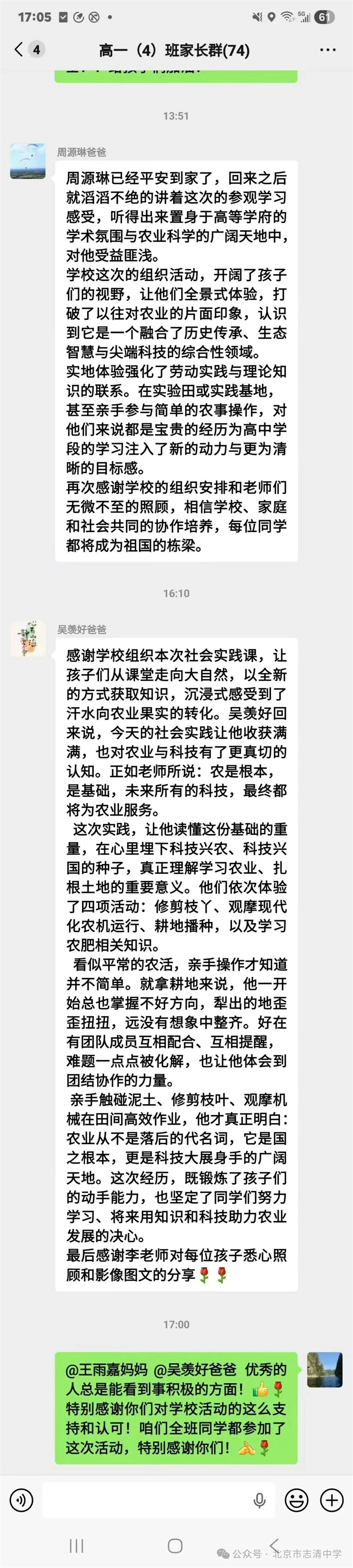 本次学农实践活动圆满落幕,班级群里好评不断!家长们纷纷留言,为学校精心组织点赞。